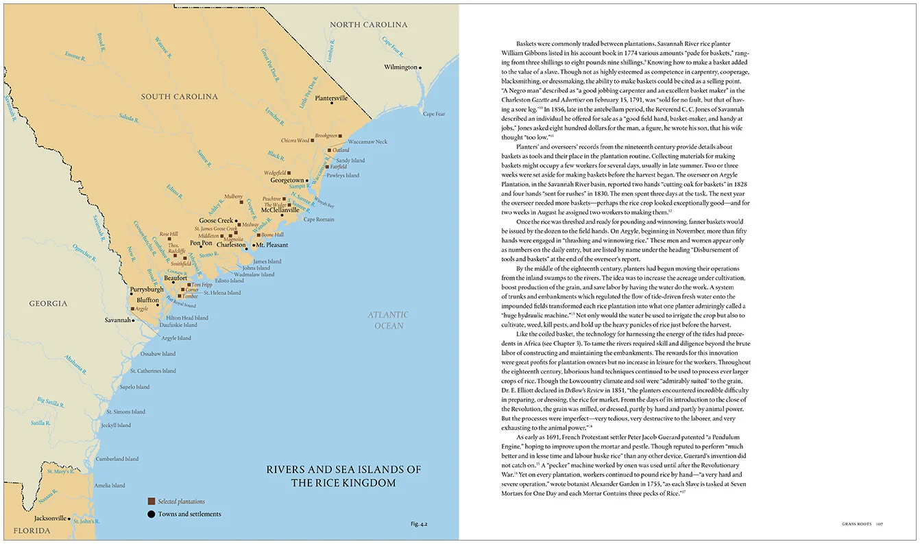 This exhibition catalogue traces the African origins of rice cultivation baskets, whose offshoots are still produced in North Carolina today. Reflecting both social and art-historical perspectives, the variety of graphic elements—including formal African art images, historical photos, contemporary paintings and photographs of handmade baskets new and old—were a welcome challenge in the creation of this unusual social history. Florio Design’s work featured seven highly detailed maps, as well as layout and photography direction that maximizes the visual impact of these fragile and textured handwoven artifacts.