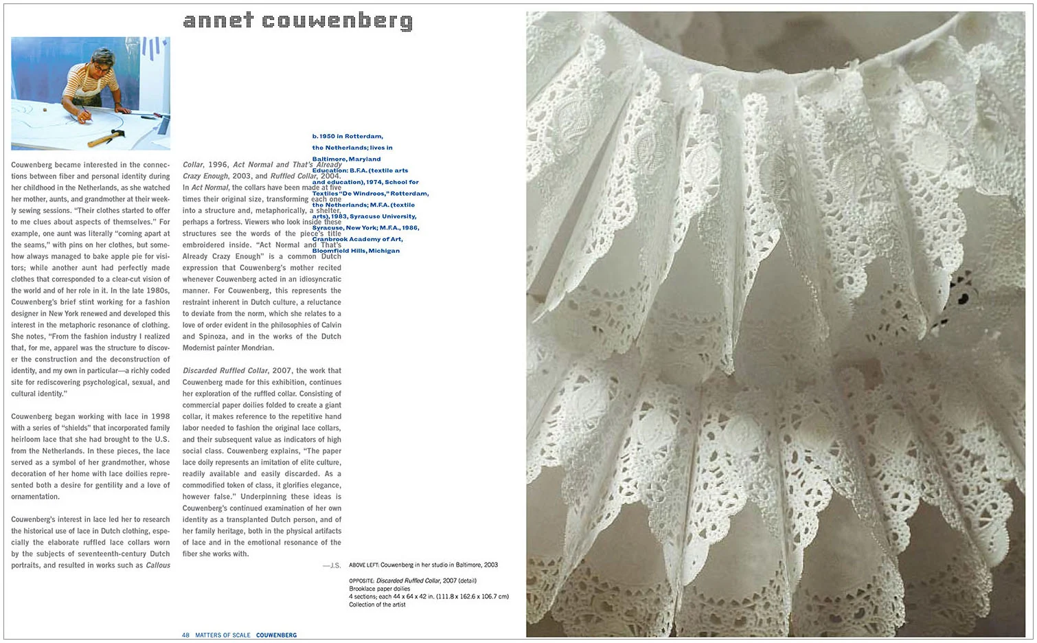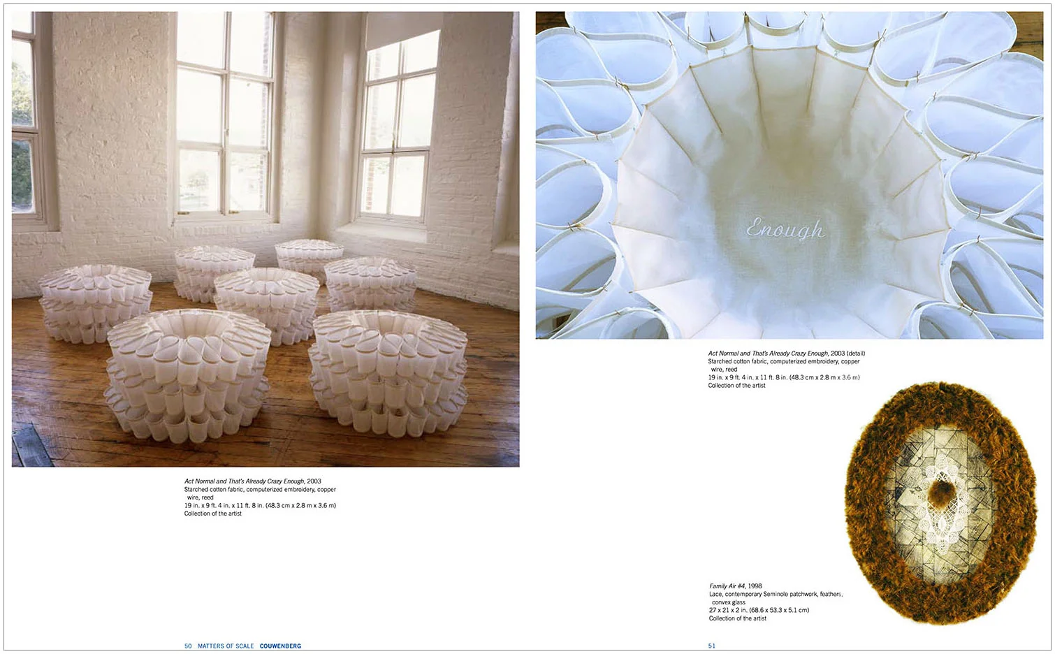 Inspired by the obtuse yet tactile qualities of the objects in the exhibition, this book’s thick flexible structure reinforces the ideas inherent in the art. Florio Design employed a soft, uncoated paper and a French-fold lay-flat binding, which allows the consistent use of narrow borders and a carefully formulated grid. The resulting tension reminds the viewer this is not a dusty “lace” and “knitting” enterprise, but expression that has been taken to its radical and subversive extreme.